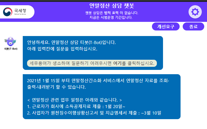 그래서 연말 정산 상담 챗봇에 물어보니 2020년 소득 공제 자료는 2021년 1월 15일 이후에 제공됩니다.