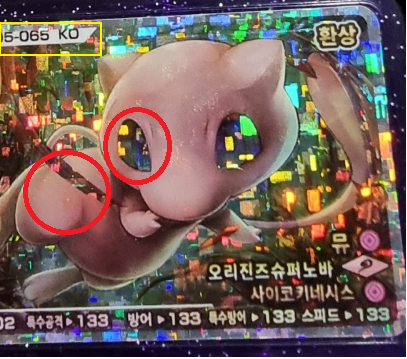 가품의 뮤츠 입니다. 전체적으로 어두운 색감이며 오른쪽 구슬 부분의 홀로그램이 뭉개져있습니다.